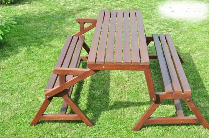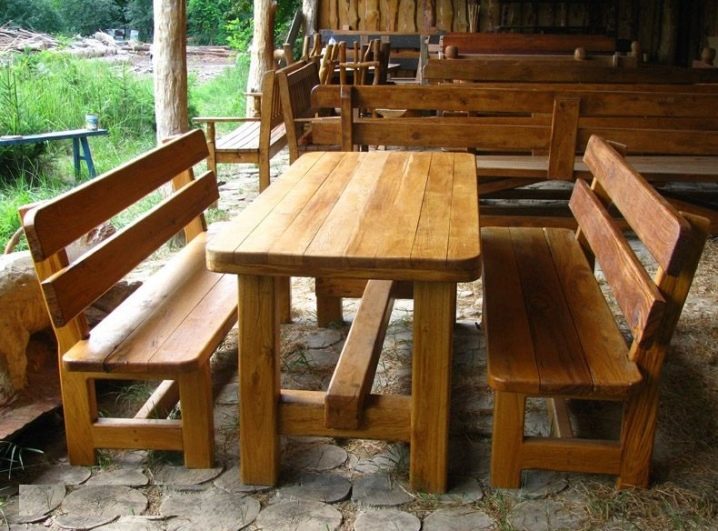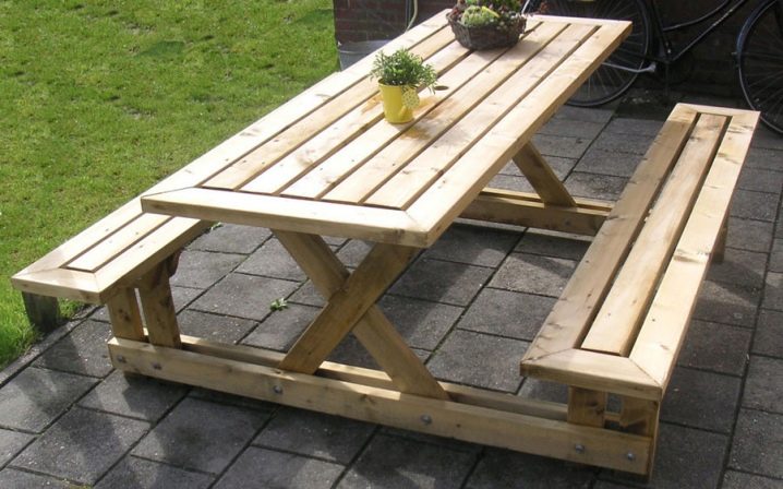 استمرارًا للعمل ، يمكنك أيضًا إرفاق مقاعد بالجدول – اجعلها جزءًا من هيكل واحد. من الأفضل توصيل المقعد بالطاولة بألواح خشبية خاصة باستخدام المسامير أو دبابيس الشعر الطويلة. الغسالات والصواميل مطلوبة أيضًا لضمان الموثوقية. المقاعد نفسها مصنوعة وفقًا لمبدأ مماثل ، فقط ارتفاعها ، بالطبع ، أقل من الطاولة ، ويجب أن تكون الحوامل أكثر موثوقية – من الأفضل صنع صليبي.