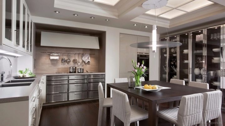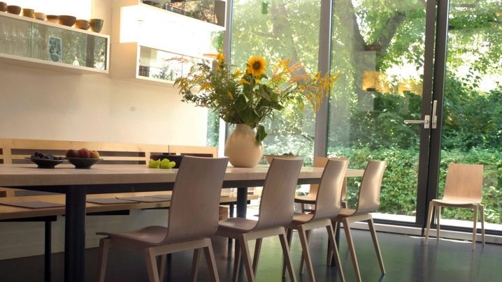 الجدول ، على الرغم من أن العنصر الرئيسي للداخلية في مثل هذه الغرفة ، لا ينبغي أن يشغل كل المساحة. لذلك ، خاصة في المطابخ الصغيرة ، من العملي جعلها مربعة – يمكنك الاقتراب من جميع الجوانب ، ولا يزال من غير المحتمل أن يتناسب أكثر من أربعة أشخاص خلفها. من ناحية أخرى ، في غرف الطعام الكبيرة ، من الأفضل الالتزام بالتنسيق الكلاسيكي المستطيل..