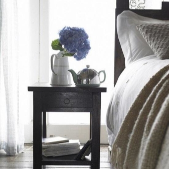 بالنسبة لغرفة النوم المزينة بألوان داكنة ، فإن الملمس الناعم الداكن مناسب. يمكن رسم الطاولة باللون الأسود. وبالتالي ، ستصبح بقعة ملونة في الغرفة ، مما يعطي تباينًا إضافيًا للسرير والأرضية. سيظهر تأثير بصري لطيف إذا وضعت عليه دورق من الماء وكوبًا.