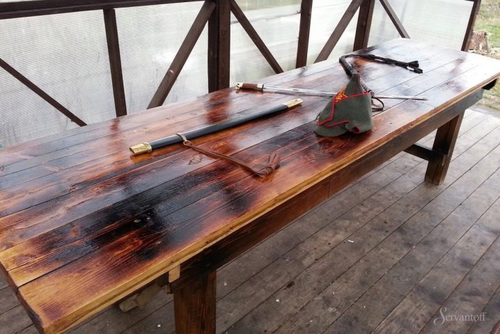 الشيء الرئيسي هو إزالة الوبر والنشارة منه ، حيث يمكن أن تؤدي إلى إصابات غير سارة وعميقة أو مجرد شظايا. يرجى ملاحظة أن السطح يجب أن يكون مقاومًا للرطوبة – ستبلل الطاولة بانتظام في المطر. في حالة هطول الأمطار الغزيرة أو مجرد الغياب الطويل عن البلاد ، من الأفضل تغطيتها بشيء ، على سبيل المثال ، قماش زيتي. لن يخلصك ذلك من الرطوبة العالية ، لكنه سيحميك من الاتصال المباشر بالماء..