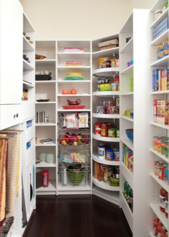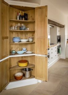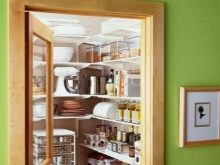 إذا كان لديك رفوف عالية ، فيجب عليك تخزين سلم معدني قوي., بحيث يمكنك الحصول على العناصر التي تحتاجها بسهولة. إذا كان لديك مساحة كبيرة جدًا ، فستكون خيارات خزانة الزاوية هي الحل الأفضل. هنا يمكنك مشاهدة تركيب الوحدة الدوارة. ستساعد الأبواب المنزلقة ، بالإضافة إلى العديد من المعدات الموجودة فوق الباب لتخزين المنتجات في توفير المساحة.