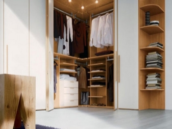 يفترض تخطيط الزاوية خزانة زاوية مقابلة. يتميز هذا النموذج بوقوعه في الزاوية. هذا الأثاث واسع جدًا ومريح ، لأنه يسمح لك باستخدام المساحة التي غالبًا ما تظل غير مطالب بها في التصميم. سيكون هذا صحيحًا بشكل خاص للغرف الصغيرة. هنا يمكنك وضع الأشياء الأساسية ، وكذلك أقلام التلوين. إذا كانت هناك مساحة إضافية ، فيمكنك ترتيب الأرفف على الجدران. من الجيد أن تحتوي خزانة الملابس على مجموعة متنوعة من الأدراج تجعل الأثاث مريحًا في الاستخدام..
