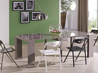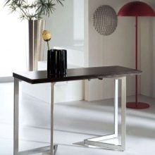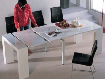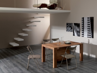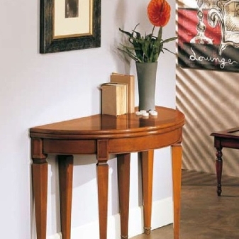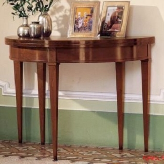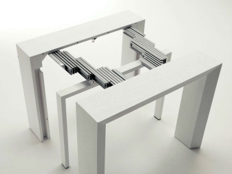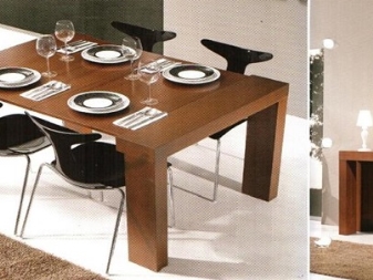 والميزة الرئيسية لجدول التحويل هذا هي حقيقة أنه عند طيها ، لا تختلف الطاولة على الإطلاق عن وحدة التحكم العادية ، والجلوس عليها يكون أكثر راحة من كتاب طاولة مطوي ، عندما لا يكون هناك مكان لوضعه. قدمك.
