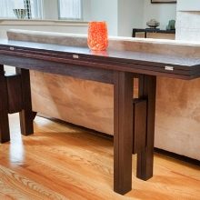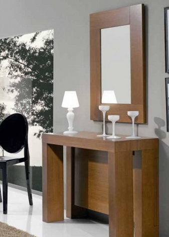 - يمكن وضع الكونسول الطويل بجوار الأريكة في غرفة المعيشة. هذا مناسب للغاية ، أولاً ، لأنه عند طيها ، من الملائم جدًا وضع فنجان من القهوة أو مصباح أو كتب. وثانيًا ، أثناء وصول الضيوف ، لن يستغرق الأمر وقتًا طويلاً لفتح وحدة التحكم وتنظيم عشاء عائلي كبير..