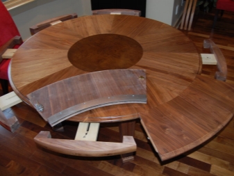ستعتمد الآلية المستخدمة أيضًا على نوع التحويل. على سبيل المثال ، غالبًا ما تزداد مساحة الجدول بسبب أجهزة الكمبيوتر اللوحية الإضافية. النماذج الأكثر شيوعًا مع ملحق مركزي. ولكن هناك خيارات مع إدخالات جانبية. إذا لزم الأمر ، يتم دفع نصف سطح الطاولة بعيدًا ، ويتم إخراج جزء إضافي ، ويتم دمج الأخاديد ويتم إزاحة جميع الأجزاء. الإدخالات هي:
