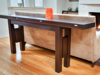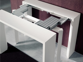 - وحدة التحكم – عند التجميع ، تكون طاولة حائط أو حامل للأشياء الصغيرة. معظم النماذج ضيقة وطويلة الشكل ، ولكن يمكنك أيضًا العثور على نماذج نصف دائرية. هذه القطع من الأثاث مناسبة في غرفة النوم كطاولة للكتابة أو للزينة ، وفي غرفة المعيشة كطاولة جانبية أو حامل تلفزيون. في المطبخ ، يمكن استخدامه كمنضدة بار. عند تفكيكه بالكامل ، يمكن أن يصل طول هذا المحول إلى ثلاثة أمتار. التحول ممكن بفضل الآلية التلسكوبية المصنوعة من الألمنيوم. يمكن أن يكون هناك العديد من الامتدادات ، ولكن كقاعدة عامة ، هناك 3 منها على الأقل.