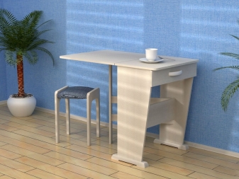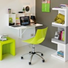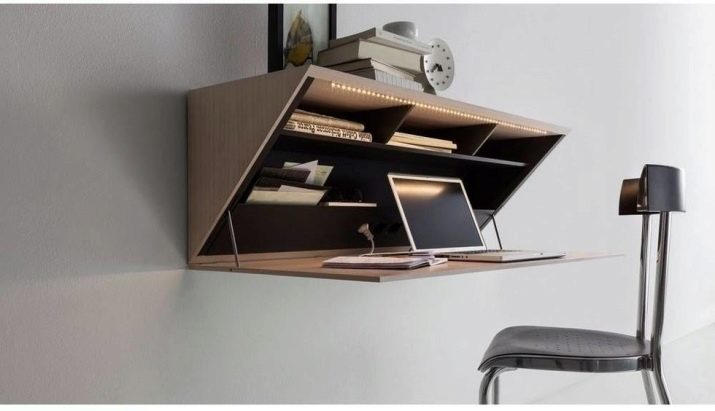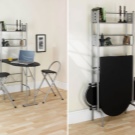 - قابلة للطي على الحائط لا يمكن تمييز الطاولة عن الحائط أو تبدو وكأنها رف ضيق. يمكن وضع طاولة الرف على البطارية وإخفائها بهذه الطريقة. حل تصميم مثير للاهتمام للغاية هو طاولة معلقة ثلاثة في واحد. حيلته هي إخفاء طاولتين بأحجام مختلفة على الحائط في وقت واحد. الصغير يتكشف أولاً ، وفوقه ، إذا لزم الأمر ، كبير. جدول الصور مصنوع وفقًا لمبدأ مماثل. يمكن أن يكون الجزء العلوي من الطاولة القابلة للطي باب خزانة حائط. سيسمح لك هذا الحل بتنظيم مكان عمل مريح في أي جزء من الشقة..