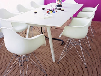 بالإضافة إلى ذلك ، العملاء مضمونون أعلى جودة للمنتج. يمكنك بسهولة تأثيث غرفة المعيشة أو تناول الطعام بكراسي Eames. لن تضيع أمام الخلفية العامة ، ويمكن للجميع فعليًا جمعها دون مساعدة خارجية. تعمل الأطراف المرنة للكراسي على حماية سطحها من التلف الميكانيكي بشكل موثوق. جميع الأجزاء المعدنية مصنوعة بطبقة خاصة ، لذا فهي مقاومة ليس فقط لدرجة الحرارة ، ولكن أيضًا للمواد الكيميائية العدوانية. أيضا ، لا يتطلب الأمر عناية خاصة أثناء العملية..