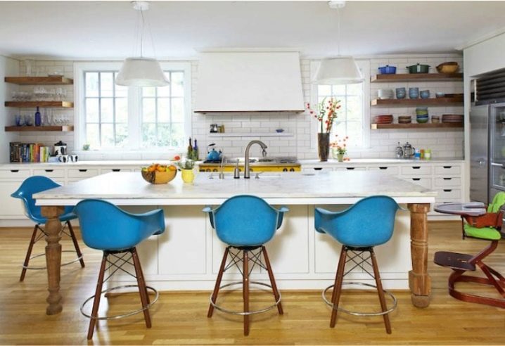 شيء آخر يجب البحث عنه عند الاختيار هو التصميم. لا يشمل مفهوم حل التصميم نظام الألوان فحسب ، بل يشمل أيضًا الشكل. على سبيل المثال ، بالنسبة للمباني الصغيرة الحجم ، يوصي المشترون في مراجعاتهم بشراء براز. إذا لزم الأمر ، فمن السهل أن تنزلق ، وسوف تشغل مساحة خالية على الأقل. بالإضافة إلى ذلك ، إذا تم استخدام الرف فقط لوجبات الإفطار أو الوجبات الخفيفة ، فإن هذا الخيار مثالي..