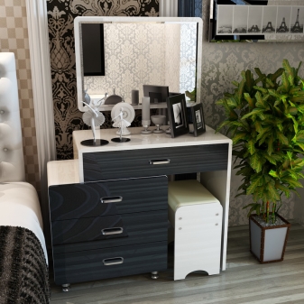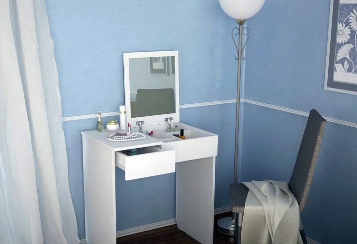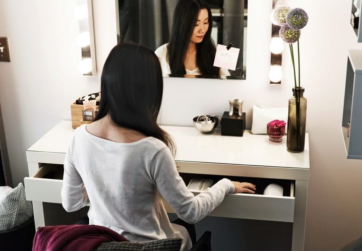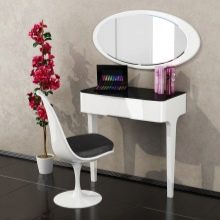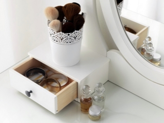 - سهولة التنظيف هي أيضًا ميزة لا شك فيها لطاولة الزينة. مستحضرات التجميل والعطور يمكن أن تلطخ سطح المنضدة بشدة. لكن طاولات الشركة السويدية مغطاة بمركب أكريليك خاص يحمي القاعدة من الأوساخ والغبار والأضرار الطفيفة. الإسفنج أو منديل مع مادة غير كاشطة لتنظيف جميع الأسطح دون عناء ؛