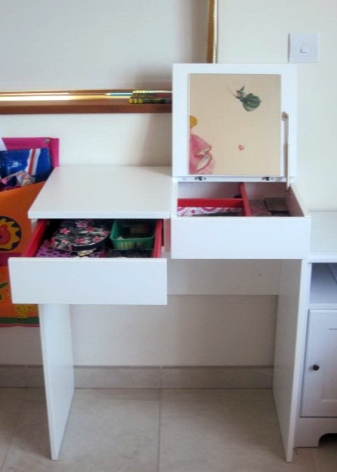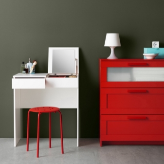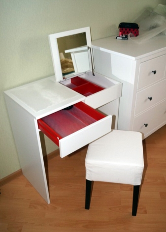الإصدار الثاني من جداول Ikea أصغر. أبعاده 70 × 42 سم فقط. “بريمنز” هو محول وظيفي ومصغر بتصميم مقتضب. سطح الطاولة مغطى بالبلاستيك ، يوجد أسفله حجرتان للتخزين. درج للأغراض الكبيرة. يحتوي الحجرة الثانية ، حيث يمكنك تخزين المجوهرات ومستحضرات التجميل الصغيرة ، على مرآة قابلة للطي بزجاج متين وشكل مستطيل. الدواخل من الصناديق حمراء زاهية. إنه يخلق لهجة عصرية ويلفت الانتباه إلى المحتوى..