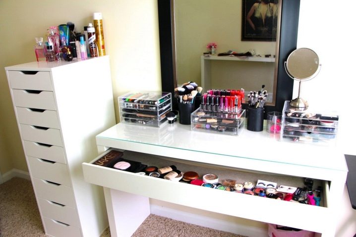 للمحترفين ، الذين يرتبط عملهم بالتطبيق المستمر للماكياج المعقد ، هناك حاجة إلى نظام تخزين كامل ومساحة خالية.