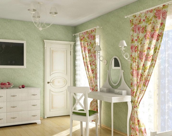 ستشكل الستائر الزهرية والألوان الخضراء للجدران والأرضيات الطبيعية صورة واحدة تكملها منضدة زينة أنيقة ومتجددة الهواء.