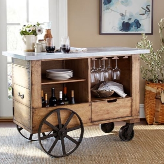 - عربات البلد. في مثل هذا العنصر ، لا يتم وضع الأطباق المطبوخة فحسب ، بل يتم أيضًا وضع الأطباق المختلفة وأدوات المائدة والمناديل وما إلى ذلك. المنتجات الخشبية على شكل عربة عادية شائعة: يمكن إنشاؤها بطريقة حديثة أو الحصول على مظهر رجعي.