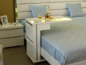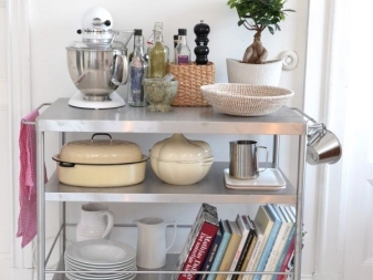 بالنسبة للمطبخ ، توجد نماذج معدنية خاصة بجوانب تمنع سقوط الأطباق. هناك نماذج مع أدراج وحتى سلة مهملات. لكن في غرفة النوم يمكنك التقاط طاولات بجانب السرير على عجلات. في المظهر ، ستشبه منضدة ، لأنها غالبًا ما تكون مجهزة بأرفف أو مقصورات مخفية لتخزين بعض الملابس..