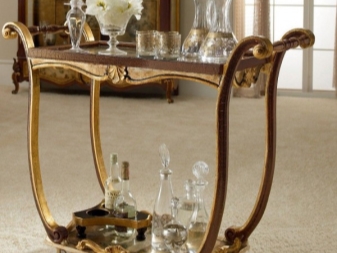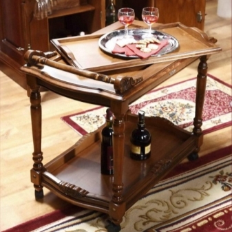 - سمات الخدمة. تم تصميم الطاولات لتقديم الشاي أو القهوة أو الطعام ، وتحتوي على صواني قابلة للإزالة. لمنع سقوط الأطباق ، قدم المصنعون قيودًا خاصة. بعض الطرز متعددة الوظائف بسبب تركيبات فريدة حيث يمكنك وضع زجاجات النبيذ والأكواب والأشياء الصغيرة الأخرى..