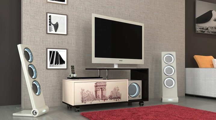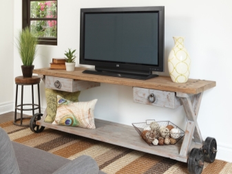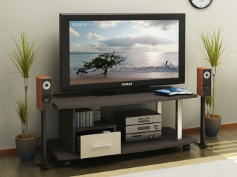 - طاولات على عجلات تسمح لك بنقل التلفزيون بسهولة إلى الجزء المطلوب من الغرفة ، مما يسهل التنظيف الرطب للغرفة ويكون مناسبًا عند إعادة ترتيب الأثاث ؛