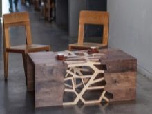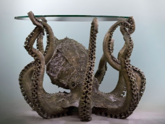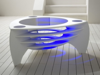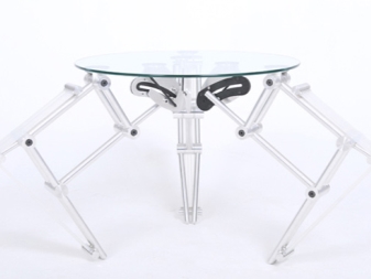 - “العنكبوت الزجاجي”. طاولة القهوة مصنوعة من الزجاج والمعدن. سوف يزين تصميمه الأصلي أي تصميم داخلي تقني. إنه عملي ليلاً ونهارًا: حتى أنه يحتوي على إضاءة منضدية مع ثلاثة لمبات مدمجة.
