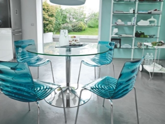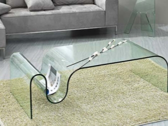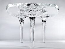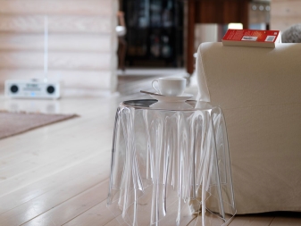 - “شبح”. تسمى طاولة القهوة بالشبح ، وهذا صحيح تمامًا. من غير المفهوم تمامًا كيف يتم الاحتفاظ بهذا الهيكل الشفاف ، حيث يتدلى مفرش المائدة الشفاف من سطح الطاولة المستديرة ، ويستقر على زوايا النسيج الوهمي ، لكن الطاولة نفسها ليست كذلك. رائع.