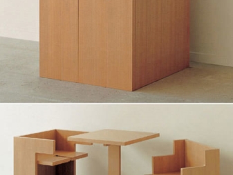 - محول خشبي. تشغل طاولة الركيزة الخشبية مساحة صغيرة جدًا. لكن هذا لم يتحلل بعد. في الوضع غير المطوي ، يتم الحصول على ثلاثة أشياء كاملة منه: طاولة وكرسيان.