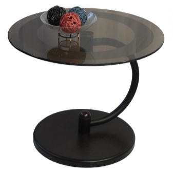 طاولة قهوة مستديرة مصنوعة من الزجاج والمعدن. يتم إعطاء أصالة هذا التصميم من خلال الساق المنحنية ، مما يجعل سطح الطاولة يطفو عمليًا في الهواء..
