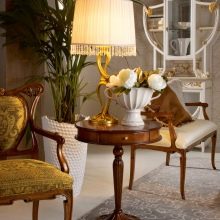 دعامة مطروقة ، مطلية بطلاء برونزي ، جنبًا إلى جنب مع سطح طاولة مصنوع من الأخشاب الثمينة ، ستجعل هذه السمة تسليط الضوء على التصميم الداخلي الكلاسيكي وتضيف الوحشية إليها.