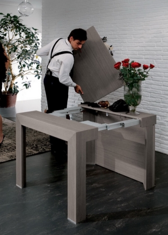 - لوحات المفاتيح. بالنسبة للعائلات الصغيرة التي ليس لديها أطفال ، يعتبر خيار الجدول هذا هو الخيار الأمثل. عند الكشف عنها ، يمكن بسهولة استيعاب العديد من الضيوف خلفها. لا غنى عنه لغرف المعيشة الصغيرة حيث تقام الأعياد بشكل غير منتظم.