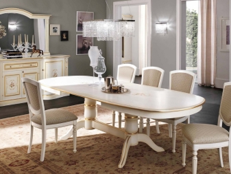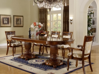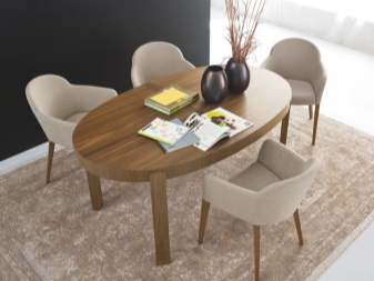 - بيضاوي. تصميم أثاث غير عادي يتميز بغياب الزوايا الحادة. الشكل المستدير يبدو أنيقًا ومتطورًا. بالإضافة إلى ذلك ، تخلق هذه الطاولات جوًا خاصًا من الراحة ، حيث تجمع الجميع معًا في التواصل..
