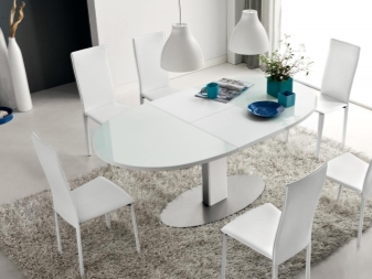 لملء غرفة المعيشة براحة غير عادية ، يجدر وضع طاولة زجاجية بيضاوية قابلة للطي فيها. هذه المادة متينة وسهلة التنظيف..