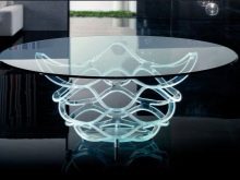 - لا تتجاهل مثل هذه التفاصيل الهامة., كملمس ومادة, التي تم إنشاء تحفة التصميم منها. على الرغم من حقيقة أن الطاولات الزجاجية هي اكتشاف حقيقي للديكور الداخلي الحديث ، امتنع عن شرائها إذا كان هناك أطفال في المنزل. يمكن أيضًا تجنب إصابات الرضع عن طريق اختيار طاولة زجاجية سميكة ذات حواف مستديرة..