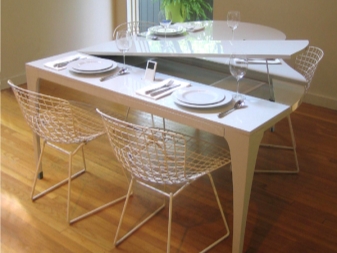 توقف عن شراء أثاث غرفة الطعام الممل ، لأنه من الأفضل بكثير أن تجمع شركة كبيرة على طاولة أصلية على شكل ملاءة. سوف تجد الخطوط الملساء ، مزيج من المعدن والخشب مكانها في أي مكان داخلي.