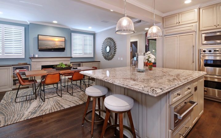 في المطابخ الحديثة ، تبدو أسطح العمل المستطيلة وحتى المربعة أحيانًا متناغمة. بالمناسبة ، المطبخ يكاد يكون المساحة الوحيدة في المنزل حيث طاولات مصممة من الرخام أو الجرانيت.