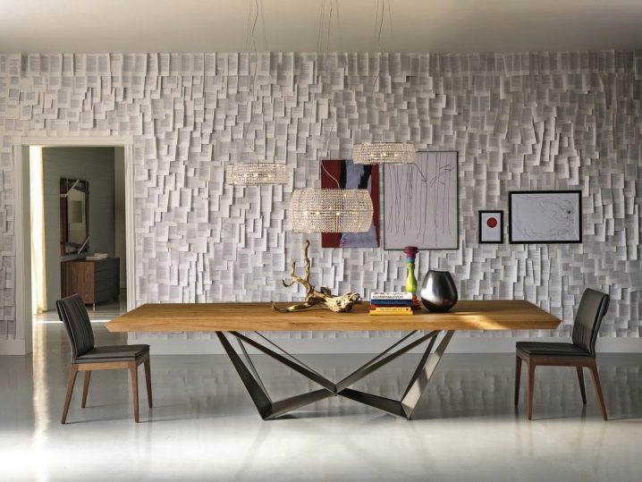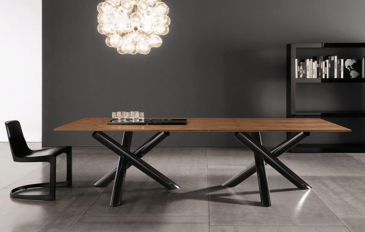 أما بالنسبة لظهور العينات المعدنية ، فهي بعيدة كل البعد عن كونها أنابيب أحادية الصوت ذات سطح أملس. اليوم ، في متاجر الأثاث ، يمكنك العثور على عناصر مصممين أكثر إثارة للاهتمام بأرجل مثنية. ستتوقف الجداول التي تحتوي على هذه المكونات عن كونها عملية فقط وستأخذ دور عنصر زخرفي في الداخل.