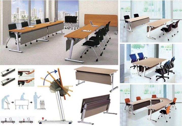 - قابلة للطي وقابلة للطي. هذه التصميمات سهلة الاستخدام ، وقياسا على خيارات الانزلاق ، توفر مساحة خالية في الغرفة. تم تجهيز الإطارات السفلية القابلة للطي بآليات بسيطة. على سبيل المثال ، يتم طي الأرجل في بعض الهياكل ، بينما توجد في البعض الآخر أنظمة زنبركية تتيح لك طي الأثاث وفكه بسرعة وسهولة..