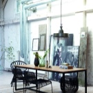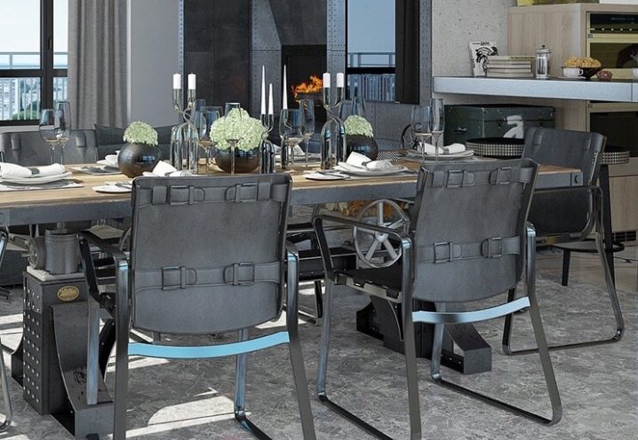 - أنشئ تصميمًا داخليًا صناعيًا أصليًا وقويًا عن طريق وضع طاولة معدنية كبيرة ذات دعامات عريضة وكثيفة تقع في نهايات مختلفة من الهيكل في المطبخ بأرضية خرسانية رمادية (تقليد) وجدران منتهية بصفائح سوداء. ضع الكراسي المعدنية مع أغطية جلدية سوداء قذرة بالقرب من هذا الأثاث.