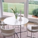 - للحصول على مجموعة مريحة وعصرية ، يمكنك شراء طاولة مستديرة بسيطة بسطح زجاجي وأربعة أرجل معدنية من الكروم. سيبدو هذا الأثاث متناغمًا في العديد من المجموعات. يمكن استكماله بكراسي ذات أرجل معدنية منجدة بجلد أبيض ثلجي.