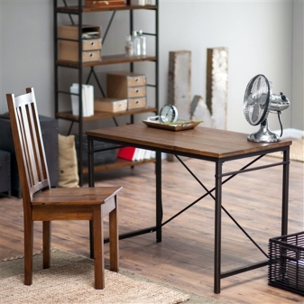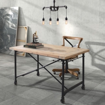 - بأسلوب علوي غير رسمي ، ستظهر بشكل متناغم طاولة كتابة صغيرة ومقتضبة مع سطح خشبي بني وأرجل رفيعة سوداء معززة بخطوط متصلة. بجانب هذا الأثاث ، يمكنك وضع كرسي خشبي بسيط. سيبدو هذا الترادف جيدًا في غرفة ذات جدران فاتحة وأرضية خشبية. ادعم القاعدة المعدنية للمكتب برف كتب مماثل بالقرب من أحد الجدران.