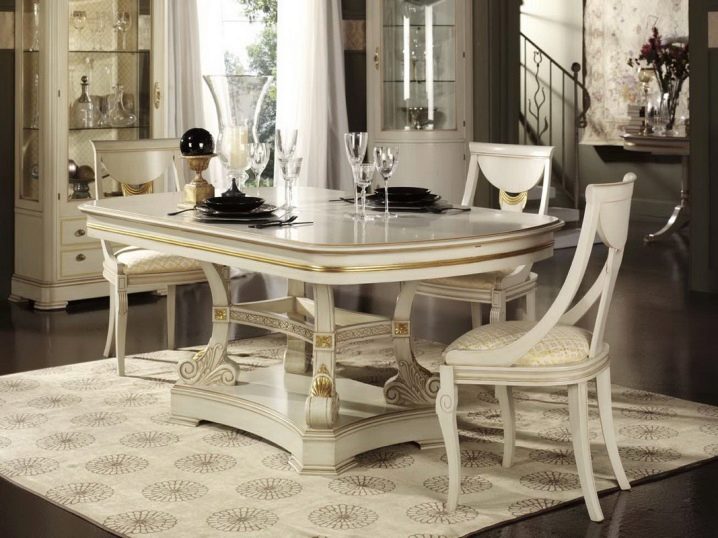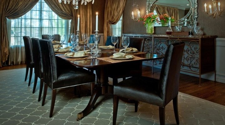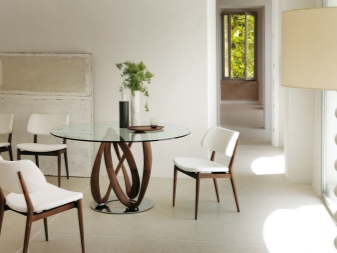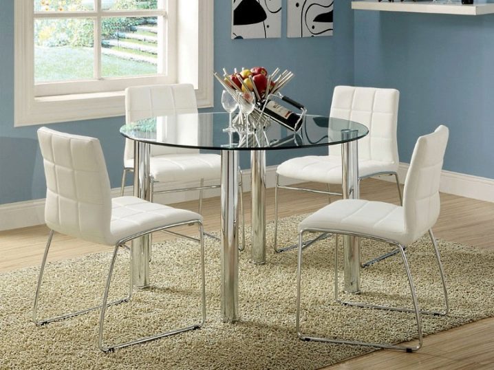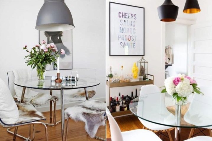 - أيضًا ، يمكن دمج الطاولة المستديرة الزجاجية على أربعة أرجل من الكروم مع كراسي معدنية مزينة بفرو صناعي. يبدو حل التصميم هذا جديدًا ومثيرًا للاهتمام. يجب استخدامه في الغرف ذات التشطيبات الخفيفة للجدران والأرضيات الخشبية..