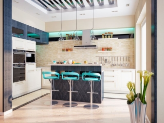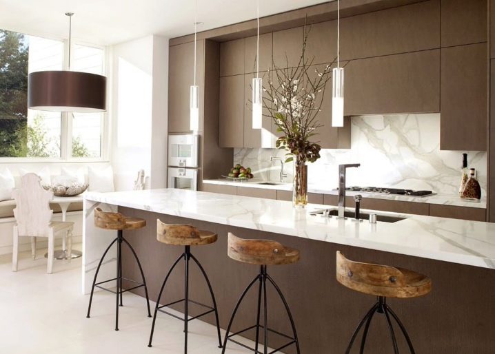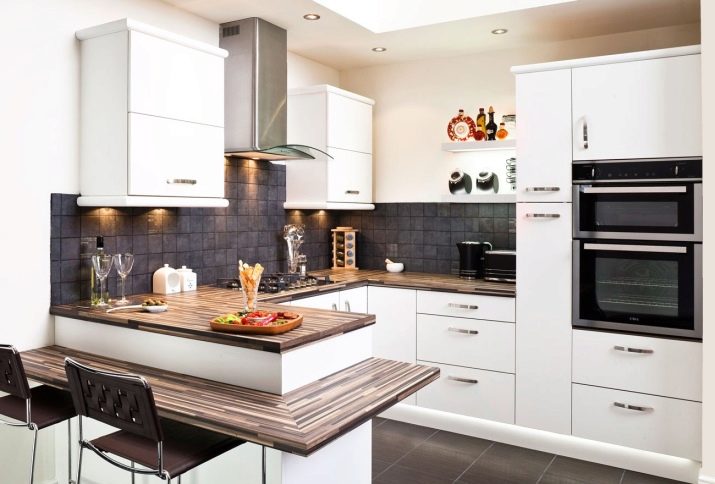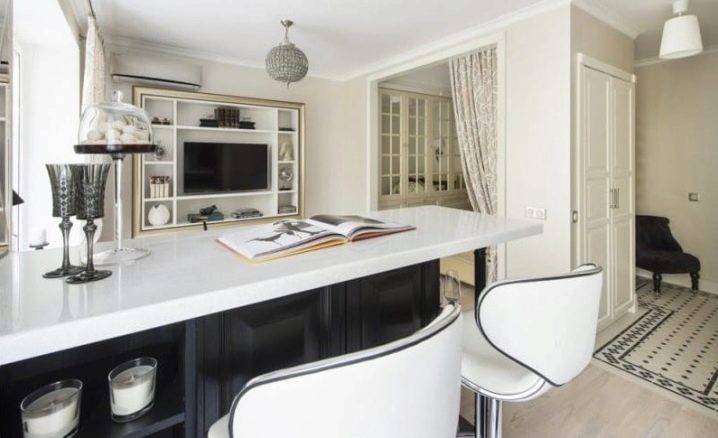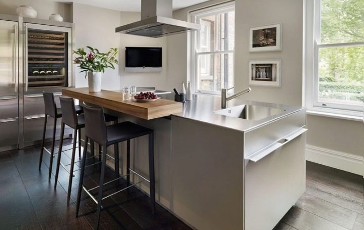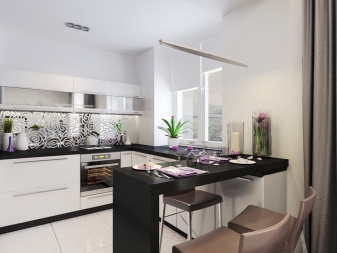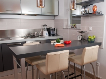 تعتبر طاولة البار بديلاً ممتازًا لنماذج الأثاث التقليدية ؛ ومن الملائم تناول وجبة سريعة فيها. كقاعدة عامة ، يتم صنع الطاولة على ساق وتكملها منضدة جميلة ورفوف وتجهيزات مختلفة وأضواء. هذا النوع من الأثاث هو الأكثر أناقة وملاءمة للمطبخ ، لأنه إذا انكسر أي جزء من الطاولة ، فلا داعي لتغييره بالكامل. تبدو طاولة البار المرتفعة مثيرة للاهتمام بشكل خاص في مطبخ الزاوية ، فهي تقسم الغرفة وتجعلها مناسب للأكل.. يجعل التصميم غير المعتاد لأسطح العمل من السهل اختيار الأثاث لأي تصميم للغرفة.