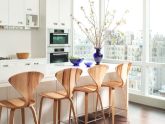 أيًا كان طراز طاولة البار الذي يتم اختياره ، يجب على أي حال استكماله بمقاعد أو مجموعة من الكراسي. إذا سمحت مساحة المطبخ ، فسيكون القرار الصحيح هو اختيار الكراسي الكبيرة ذات الظهر المريحة. بالنسبة للغرف الصغيرة ، كقاعدة عامة ، يتم شراء براز مضغوط عالي. يفضل بعض الأشخاص مقاعد مائلة متصلة مباشرة بقاعدة الطاولة..