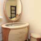 - على شكل حرف “G” – الطاولة مصنوعة على شكل الزاوية نفسها. غالبًا ما تكون المرآة مفقودة أو صغيرة الحجم. الميزة الرئيسية لهذا الخيار هي خصائصه الفسيحة المثيرة للإعجاب ، مما يسمح لك بتثبيت العديد من الركائز الضخمة..