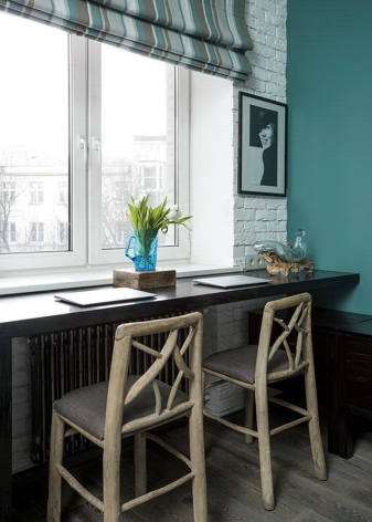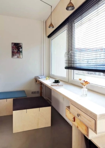 لا تشغل الطاولة الموجودة في فتحة النافذة مساحة كبيرة ، مما يتيح لك دمجها مع خزانة بنفس نظام الألوان.