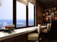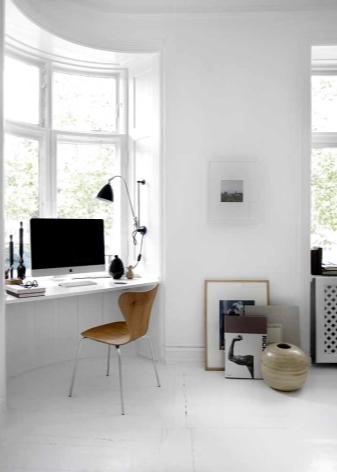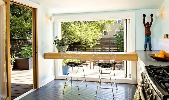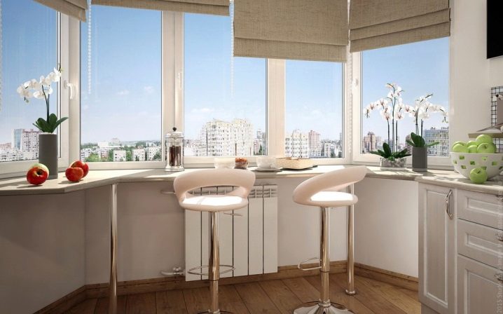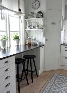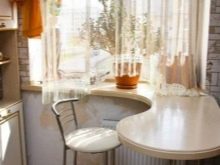 ميزة أخرى هي وضع الهيكل. في المطبخ ، يمكن لطاولة عتبة النافذة أن تحل محل طاولة طعام أو أن تصبح منطقة عمل جيدة ، مما يسعد بإضاءة كافية بدون مصادر محلية إضافية.