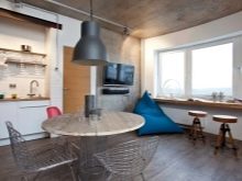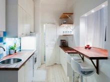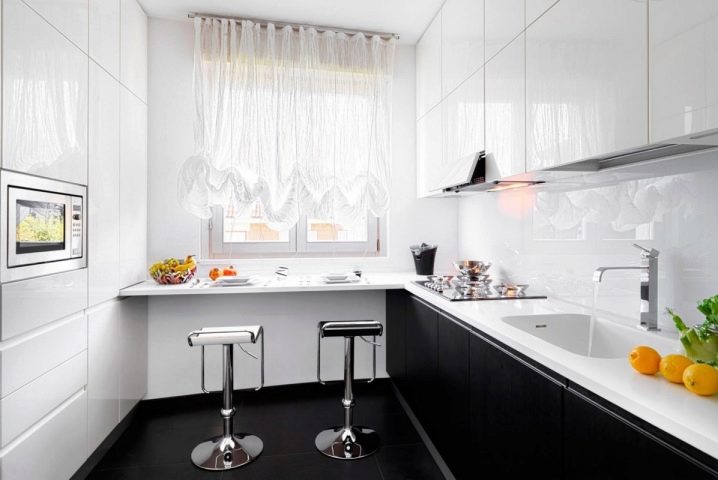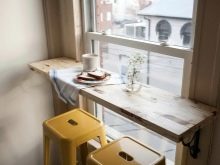 يمكن أن يكون خيار المطبخ الصغير عبارة عن طاولة طعام عتبة النافذة ، جنبًا إلى جنب مع منطقة العمل. يمكن اعتبار هذا الاستمرار ناجحًا لعائلة مكونة من شخصين..