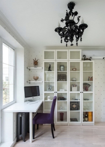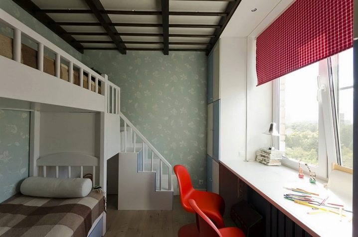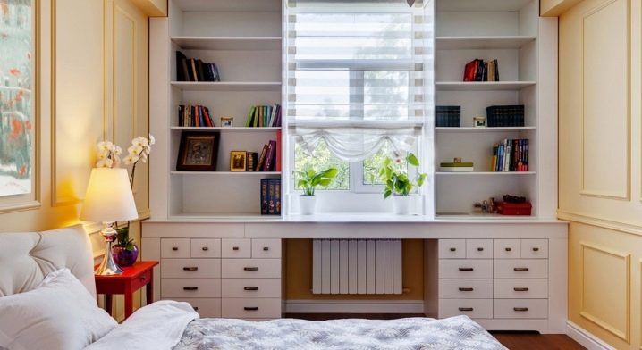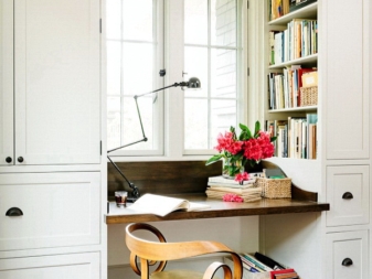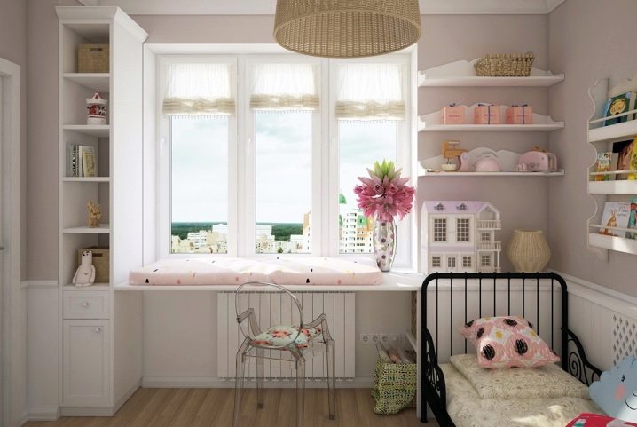 تتيح لك عتبة النافذة على شكل طاولة مع حقائب أقلام توفير مساحة مفيدة في غرفة الأطفال. تتمتع الخزائن الطويلة بسعة قصوى ، مما يسمح لك بوضع السمات المطلوبة حقًا على الطاولة فقط في الوقت الحالي ، على سبيل المثال ، الكمبيوتر.