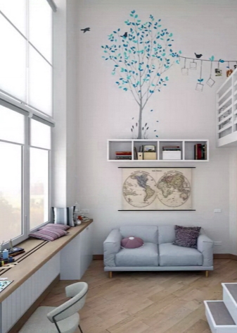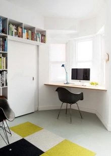 عتبة النافذة مع كونترتوب في غرفة المعيشة مصنوعة من قطعة واحدة ، دون إمكانية الطي. النماذج هنا هي امتداد لخزائن الكتب أو جزء من الحائط حيث توجد أجهزة التلفزيون أو وحدات الكمبيوتر بشكل مريح. عرض وطول أسطح العمل صغيرة ، لأن هناك بالفعل العديد من المناطق المهمة الأخرى في هذا المجال. في القاعة ، يتم توصيل كرسي صغير على عجلات بالنموذج ، مما يسمح ، إذا لزم الأمر ، بنقله بسرعة إلى مكان آخر.