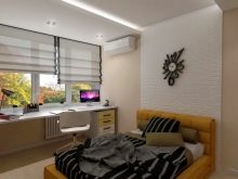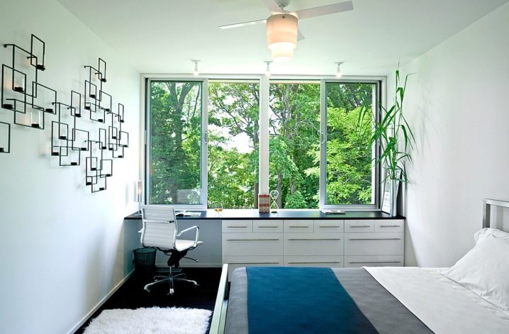 تفصل طاولة أنيقة على الحائط بالكامل في الجزء الداخلي من غرفة النوم منطقة العمل والاستجمام بنجاح. يسمح لك الإصدار القابل للسحب من الأدراج الموجودة أسفل سطح العمل بعدم ازدحام مثل هذا المكان الحميم في الشقة بوثائق العمل.