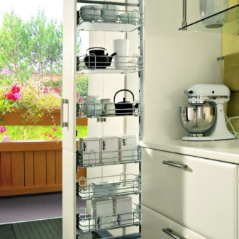 - يمكن تركيب العديد من الأجهزة المنزلية بسهولة في المساحة الداخلية لخزانة المطبخ. بفضل الارتفاع العالي ، يمكن تركيب ثلاجة. هناك خيار آخر يتمثل في دمج العديد من الأجهزة الكهربائية في نفس الوقت: فرن ميكروويف وآلة لصنع الخبز وآلة لصنع القهوة..