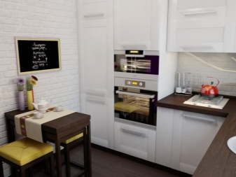 - في الغرف الصغيرة ، يكون الأثاث الخفيف أكثر ملاءمة ، لذا فإن علبة أقلام الرصاص البيضاء أو لون بلوط الحليب مناسبة لمطبخ صغير.