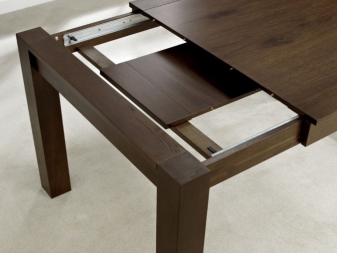 لذلك ، غالبًا ما يتم تصنيع الأرجل والسحابات والإدخالات منها. تستخدم الآليات المعدنية في تصنيع الجداول المنزلقة. إنها مخفية عن الأنظار وتقع أسفل سطح الطاولة ، ولكن في نفس الوقت تضمن موثوقية هذا الهيكل. يستخدم الخشب فقط لتصنيع أسطح العمل. يمكن أن تكون هذه الأصناف التالية.